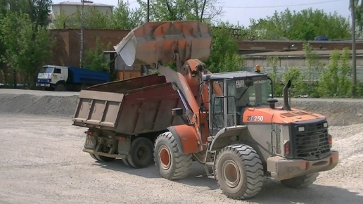 Погрузчик Hitachi ZW250 грузит самосвалы