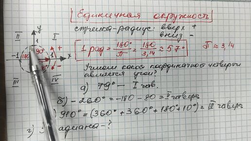 Единичная окружность. Стрелка-радиус. Радиус 1. Координатные четверти.
