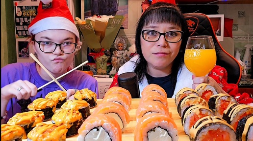 Мукбанг | Суши роллы. Роллы с огромным количеством лосося. Новогодний Обжорчик 🌲🤗С Наступающим, друзья.