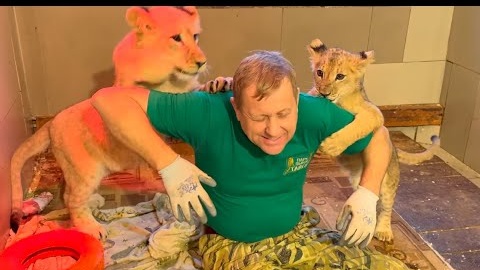 Львенок Кукла и ее подружка просто накинулись от радости на Олега Зубкова)