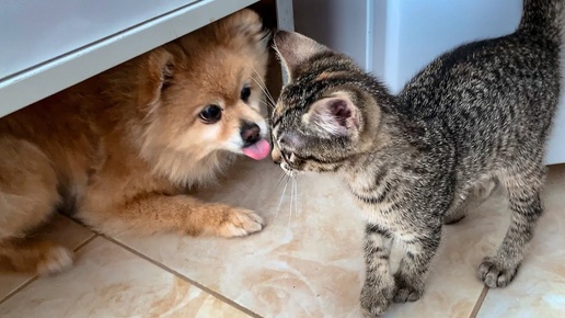 Крошечный котёнок пришёл в гости к моей собаке