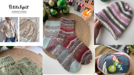 Кардиган по описанию PetiteKnit Champagne Cardigan. А так же много носочков и шапка из толстенькой пряжи.