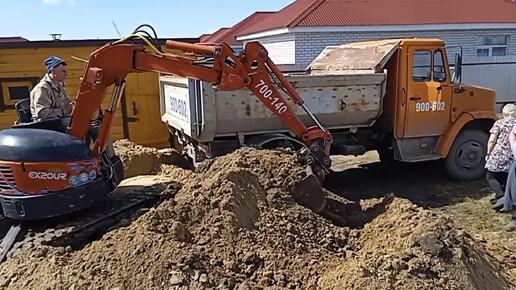 Хитачи миниэкскаватор грузит ЗИЛа.