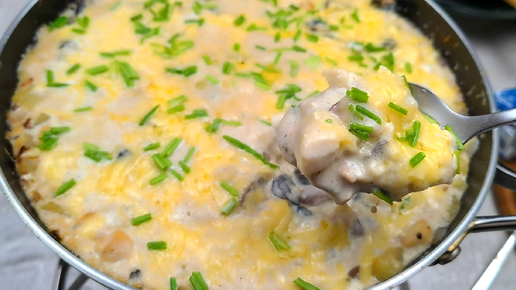 Быстрый и вкусный жульен с курицей и грибами на сковороде. Рецепт от Кулинарный гид Елена