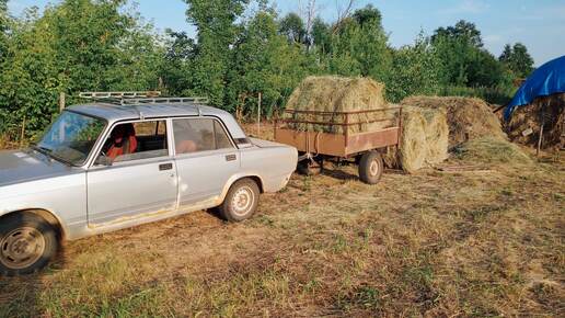 Погрузка рулона сена в прицеп легкового автомобиля.
