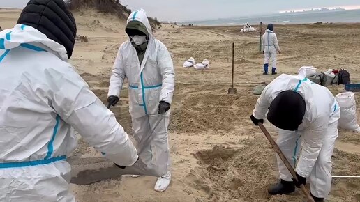 Для уборки небольших точечных загрязнений мазутом на пляже «Динамо» применяют сетки и грабли