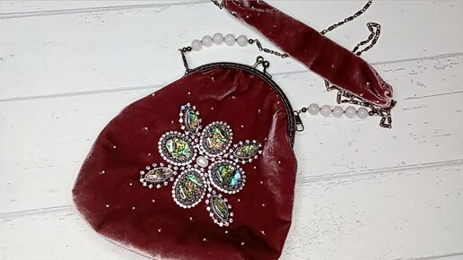 Сумочка розовая бархатная с гелиотисом, розовым кварцем, жемчугом и гематитовыми бусинами.