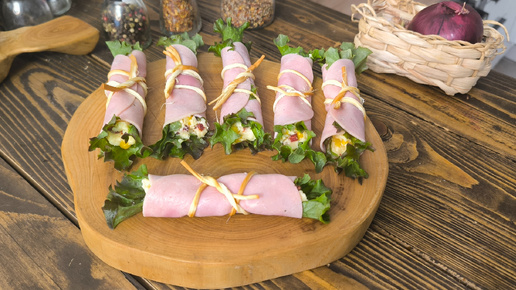 Рулетики из ветчины с сыром,, вялеными помидорами и кукурузой