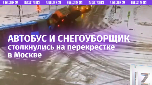 Момент столкновения автобуса и снегоуборщика на перекрестке в Москве