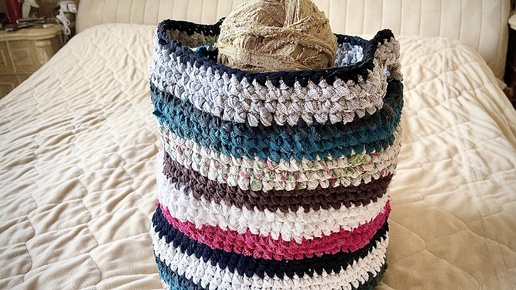 Как связать сумку-корзину из ниток нарезанных из старых ненужных вещей? #вязаниекрючком