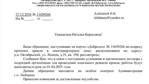27.12.2024 года. Администрация Люберец советует потерпеть до 01.04.2025 года