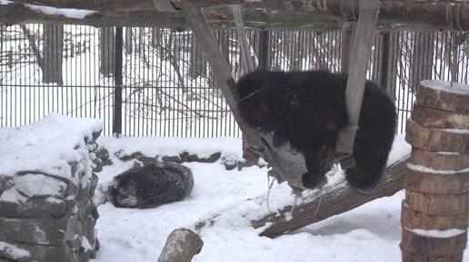 Уссурийский медвежонок девочка на гамаке, а мальчик бревно ворочает. 02.01.2025