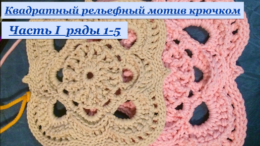 Квадрат крючком с рельефными элементами. Ряды 1-5. Миниковрик или фрагмент большого ковра. Полиэфирный шнур.