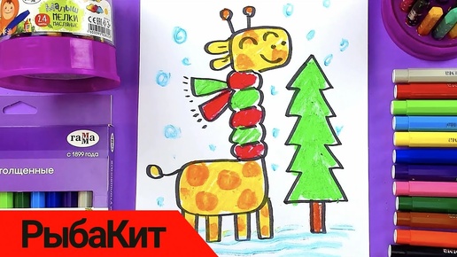 Жираф на Новый год - уроки рисования для детей от РыбаКит