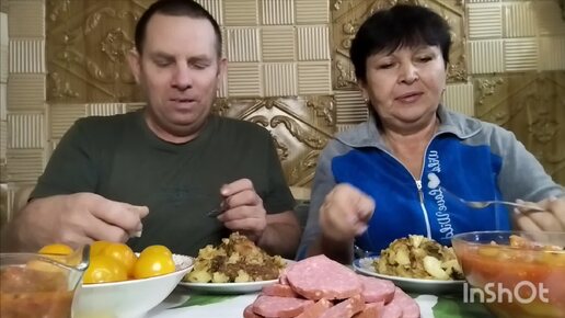 Мукбанг. Жареный картофель с крылышками. Купоренные помидоры, аджика, лечо. Хлебцы с сыром и копчёной колбасой. Компот с вишней и шелковицей