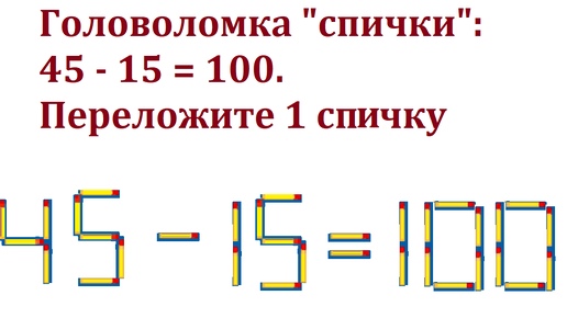 Головоломки с спичками. Исправьте выражение 45 - 15 = 100, переложив 1 спичку.