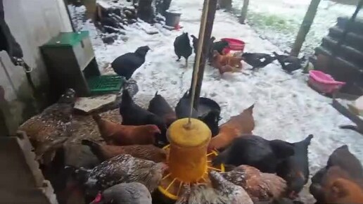 Выпал снег а дождь всё испортил.//куры на снегу.