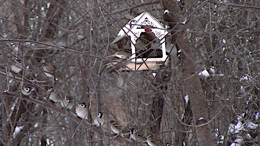 Стая нерешительных, но дружных воробьёв возле кормушки для птиц.