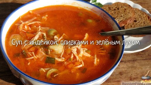 Суп из нежного мяса. Суп с индейкой, оливками и зелёным луком