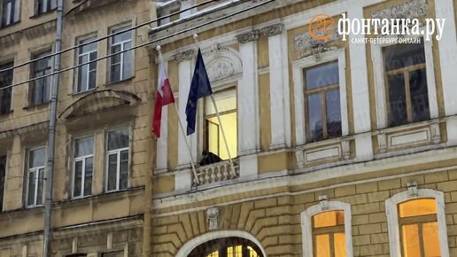 Со здания генконсульства Польши в Петербурге пытаются снять флаги. Пока безрезультатно.