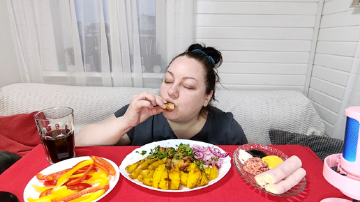 Мукбанг Шашлыки с картошечкой по-деревенски, рулетики с ветчиной и сыром.