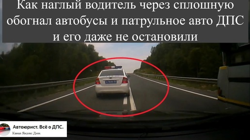 Как наглый водитель через сплошную обогнал автобусы и патрульное авто ДПС и его даже не остановили