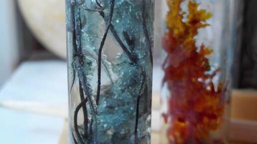 голубые кристаллы железного купороса и оранжево-красные кристаллы красной кровяной соли