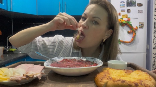МУКБАНГ БОРЩ САЛО ЛЕПЕШКА С СЫРОМ ЕДА ОБЖОР