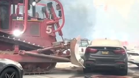 Бульдозеры разгребают брошенные жителями Калифорнии авто.