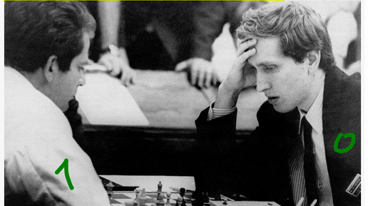 Сильнейший шахматист планеты наш Борис Спасский не без труда одолел белыми быстрорастущего гения шахмат Бобби Фишера. США, 1966, 1-0