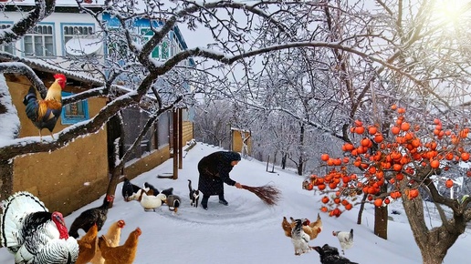 В горном Деревне Азербайджана идет снег.