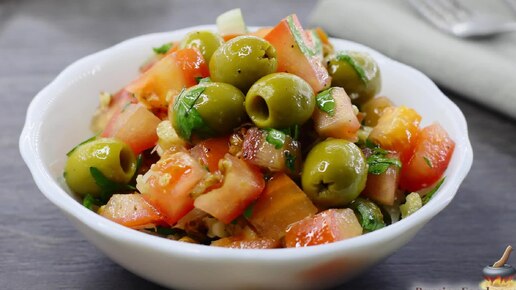 Сочно, ароматно, с кислинкой. Салат из помидоров, лука и оливок