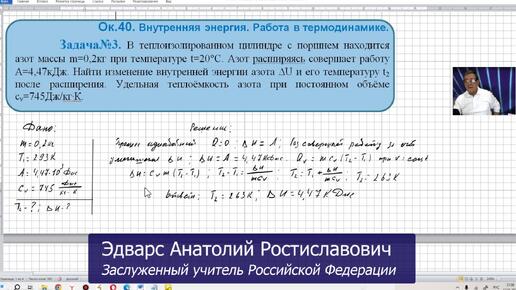 Физика10 ОК 040 Задача 3 Внутренняя энергия. Работа в термодинамике. В теплоизолированном цилиндре с поршнем находится азот массы m=0,2кг...