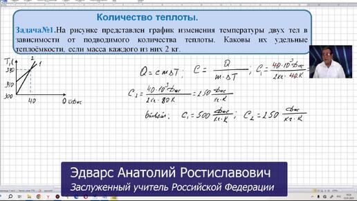 Физика10 ОК 041 Задача 1 Количество теплоты. На рисунке представлен график изменения температуры двух тел в зависимости от подводимого ...