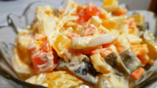 Вкусный и нежный салат из простых ингредиентов, который можно приготовить как в будний день, так и на праздничный стол.