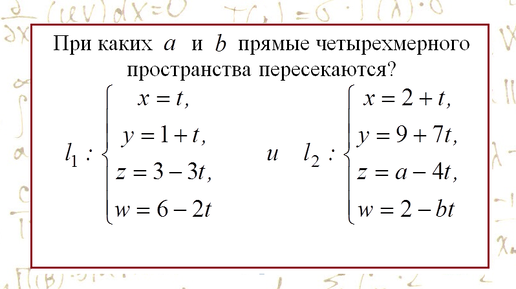 Студенческая олимпиадная задача на взаимное расположение прямых в четырехмерном пространстве.