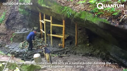 Мужчина строит скрытый ПОД скалой дом в лесу.