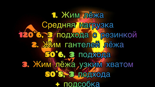 Далее: Жим лёжа 153*5, 3 подхода. Жим на наклонной 120 кг. Жим гантелей на наклонной по 45 кг. Срыв в мёртвой точки 120 кг.