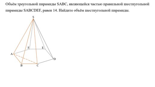 Объём треугольной пирамиды SABC, являющейся частью правильной шестиугольной пирамиды SABCDEF-1 часть ЕГЭ