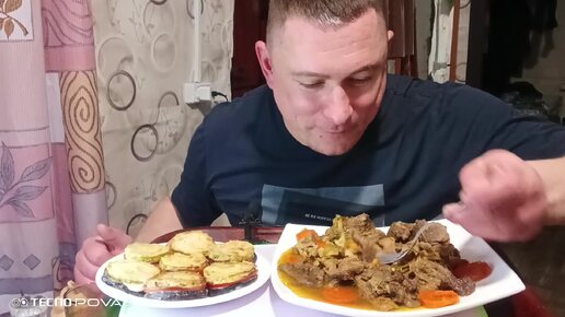 Мукбанг/обжор/тушёная говядина с овощами, бутерброды баклажанные/
