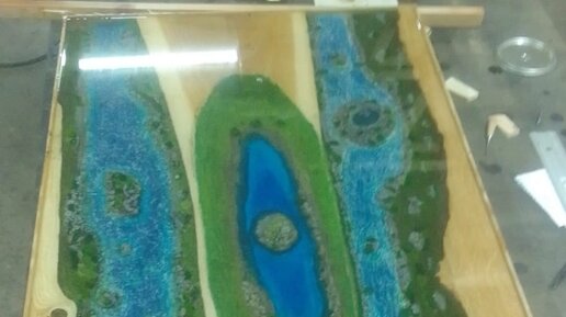 Стол диорама горные реки из эпоксидной смолы . Водопад, озеро с островом по середине , мост, вулкан с озером внутри, горные пороги.