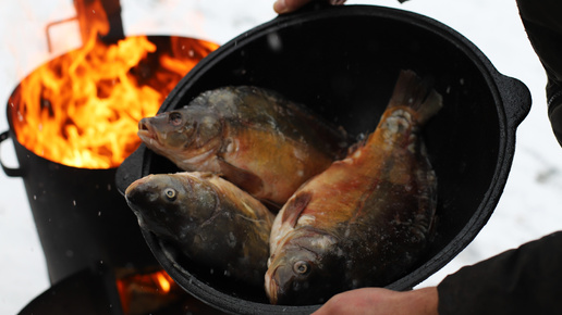 Хрустящий жареный карп с соусом в казане на костре