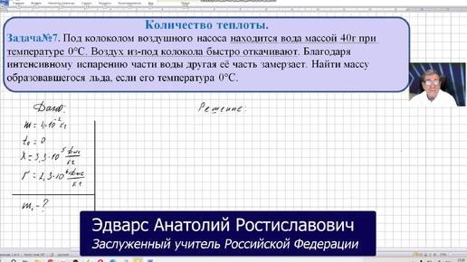 Физика10 ОК 041 Задача 7 Количество теплоты. Под колоколом воздушного насоса находится вода массой 40г при температуре 0°С. Воздух из-под...
