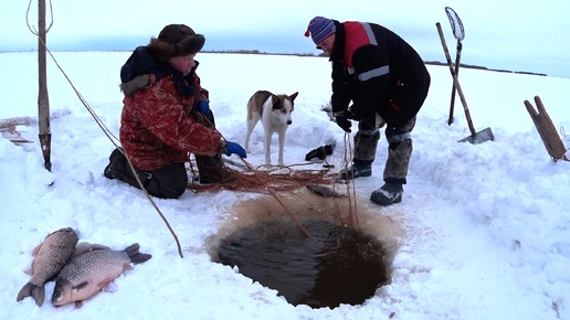 Ловля гигантского карася сетью в январе