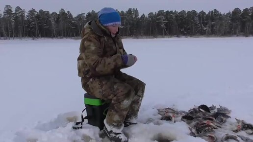 Зимняя рыбалка на окуня, клюёт один за одним.