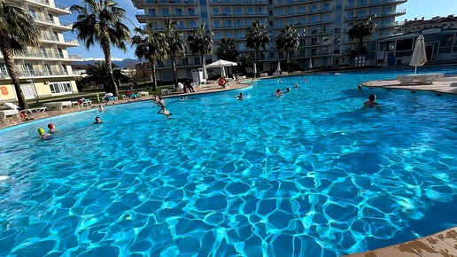 Далее: Уезжаем домой из Сочи парк отеля. На улице тепло, люди купаются в бассейне. А мы наслаждаемся морем