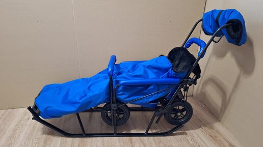 Чёрно-синие специальные санки для детей и взрослых с ДЦП (обзор)