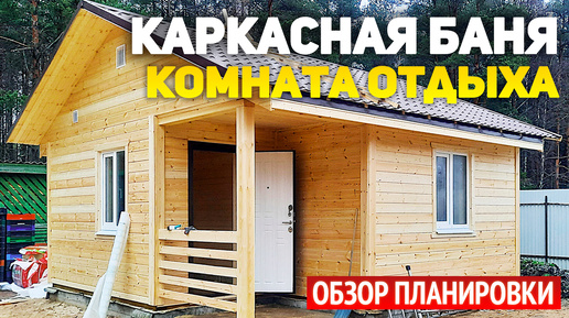 Проект одноэтажной каркасной бани 6х6 с крыльцом: комната отдыха, санузел, раздевалка, парная, помывочная
