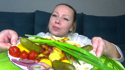Мукбанг остатки сладки, жареная картошка с сосисками, соленья и сало. еда.