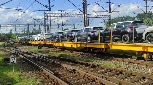 Новенькие авто едут с завода, Тепловоз М62-311D-21 с платформами автовозами